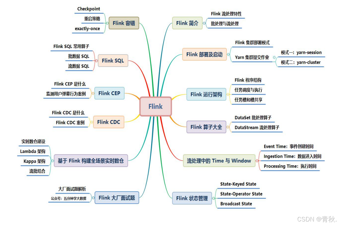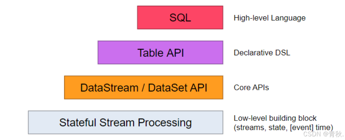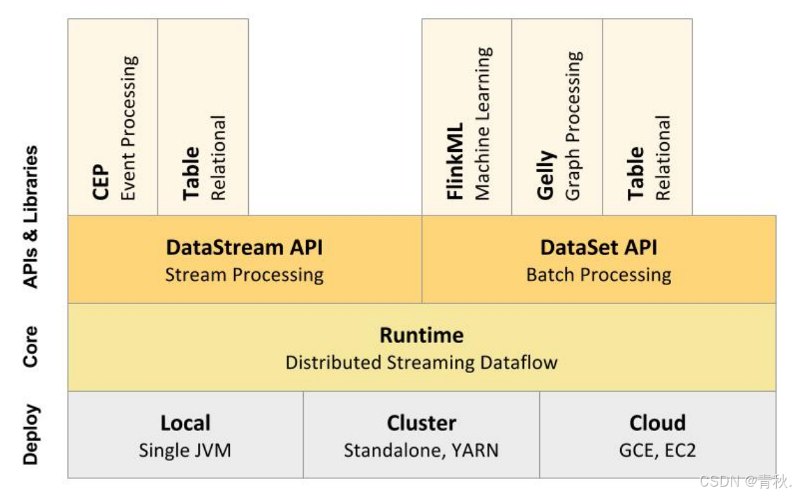 - **API & Libraries 层,提供了面向流式处理的接口(DataStream API)、面向批处理的接口(DataSet API)、用于复杂事件处理的 CEP 库**、用于结构化数据查询的 SQL & Table 库、基于**批处理的机器学习库 FlinkML 和 图形处理库 Gelly**。