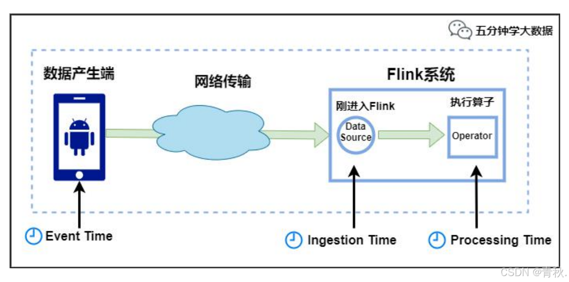 在 Flink 中,如果以时间段划分边界的话,那么时间就是一个极其重要的字段。 Flink 中的时间有三种类型,如下图所示: