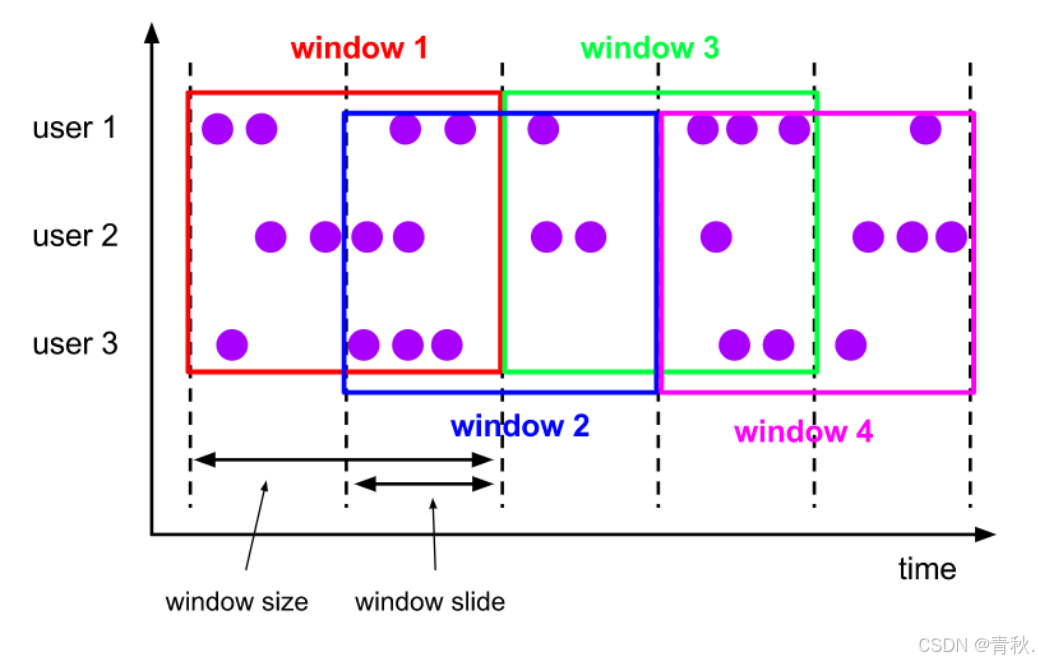 滑动窗口用于滚动进行聚合分析,例如:每隔 6 分钟统计一次过去一小时内所有商品的点击量,那么 1 天可以分为 240 个窗口,统计窗口之间存在重叠。
