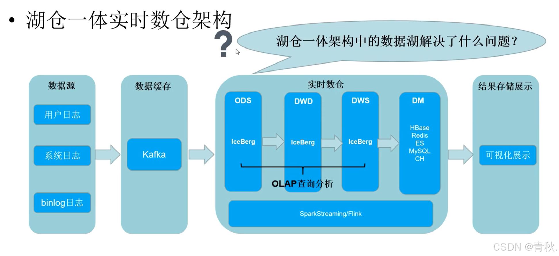 Kafka 换成了 Iceberg,IceBerg 就是数据湖技术的一种,介于上层计算引擎和底层存储格式之间的一个中间层,我们可以把它定义成一种“数据组织格式”,底层存储还是 HDFS。除此之外数据湖还有 Hudi(发展最完善)这里不具体阐述。