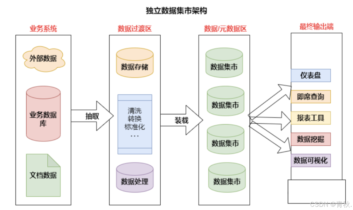 - 数据一致:因为每个数据集市的数据来源都是同一个数据仓库,有效消除了数据不一致的情况。