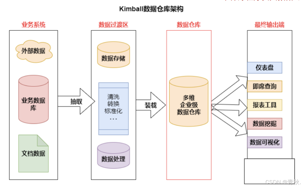- 在此架构中的数据集市也与 Inmon 中的不同。这里的数据集市是一个逻辑概念,只是多维数据仓库中的主题域划分,并没有自己的物理存储,也可以说是虚拟的数据集市。