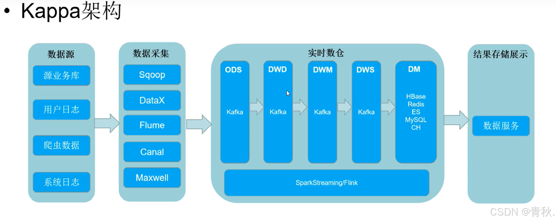 - 从 SQL 角度来看,就是数仓各层统一支持 SQL,这就弥补了 kappa 中 kafka 不支持 SQL 的缺点;