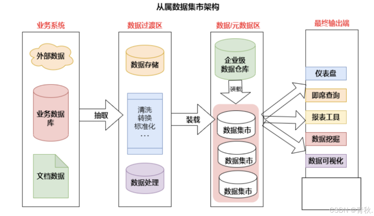 - 数据一致:因为每个数据集市的数据来源都是同一个数据仓库,有效消除了数据不一致的情况。