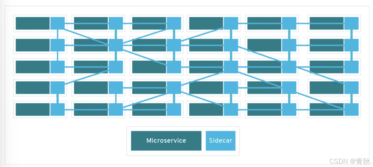 下面的网格中,绿色是一个个微服务,代表不同的功能模块,蓝色就是每个微服务的代理他们从绿色的微服务中提取出来下沉到 Istio 等设施,负责服务间的通信、监控等。