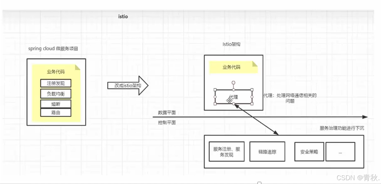 k8s“服务”资源是简化的 service mesh,它提供服务发现和请求的轮询调度均衡。完整的 service mesh 则提供更丰富的功能,如管理安全策略和加密、“断路”以暂停对缓慢响应的实例的请求以及如上所述的负载均衡等。 服务网格本质上是微服务治理,把服务治理,服务通讯,服务安全,服务监控等逻辑从业务逻辑代码中提取出来形成代理并下沉到 istio 等基础设施中,如下图: