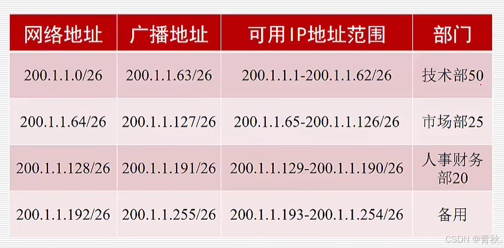 网络地址=子网掩码和 IP 地址与运算 ,得出每个子网的网络地址如下: