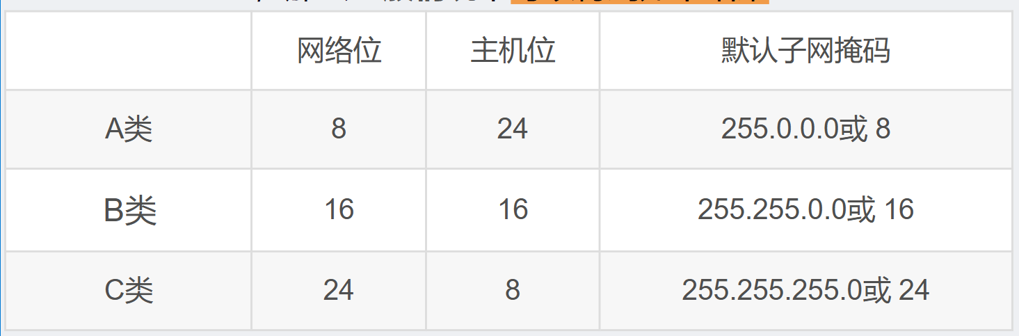 注意表格中的子网掩码是默认的,分别是 8、16、24,子网掩码和 IP 地址类别没有必然关系,并不是说 A 类就必须是 8,B 类必须是 16,A 类也可以是 22!