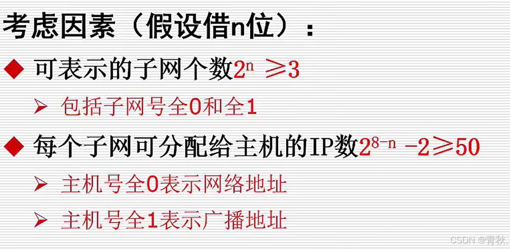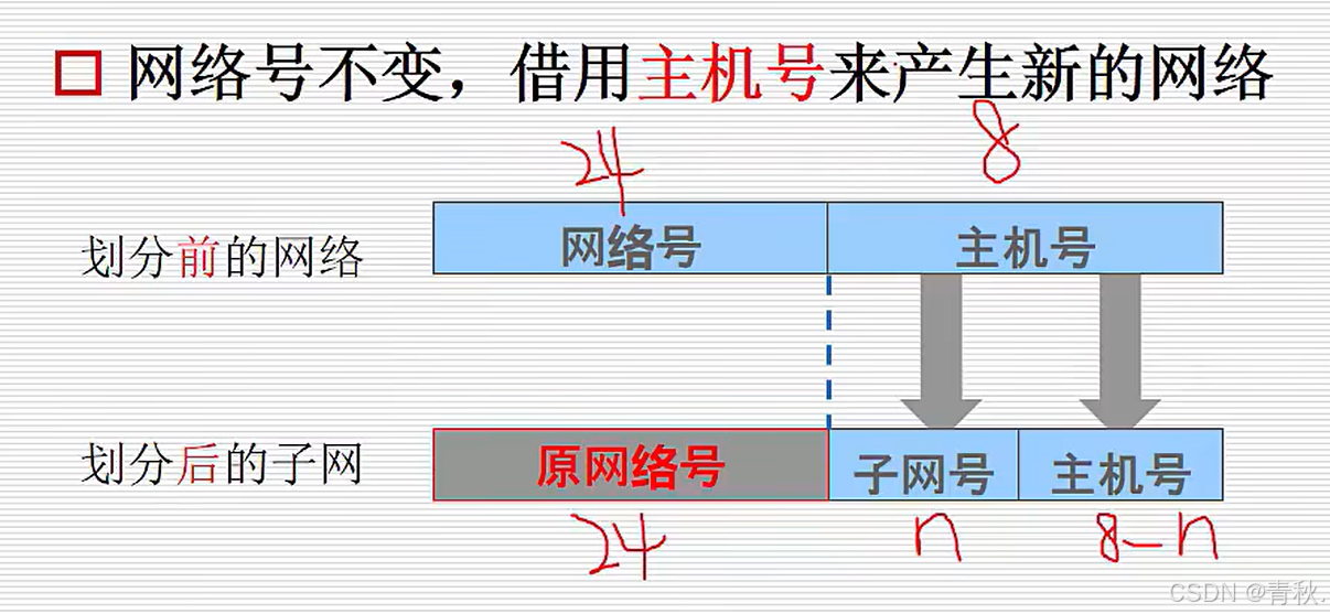 最开始我们说,IP 地址=网络号+主机号,其实这是不需要子网划分 的 IP 地址组成,如果 IP 地址需要子网划分 ,那么还要从主机号中借用几位作为子网号,此时的 IP 地址=网络号+子网号+主机号。
