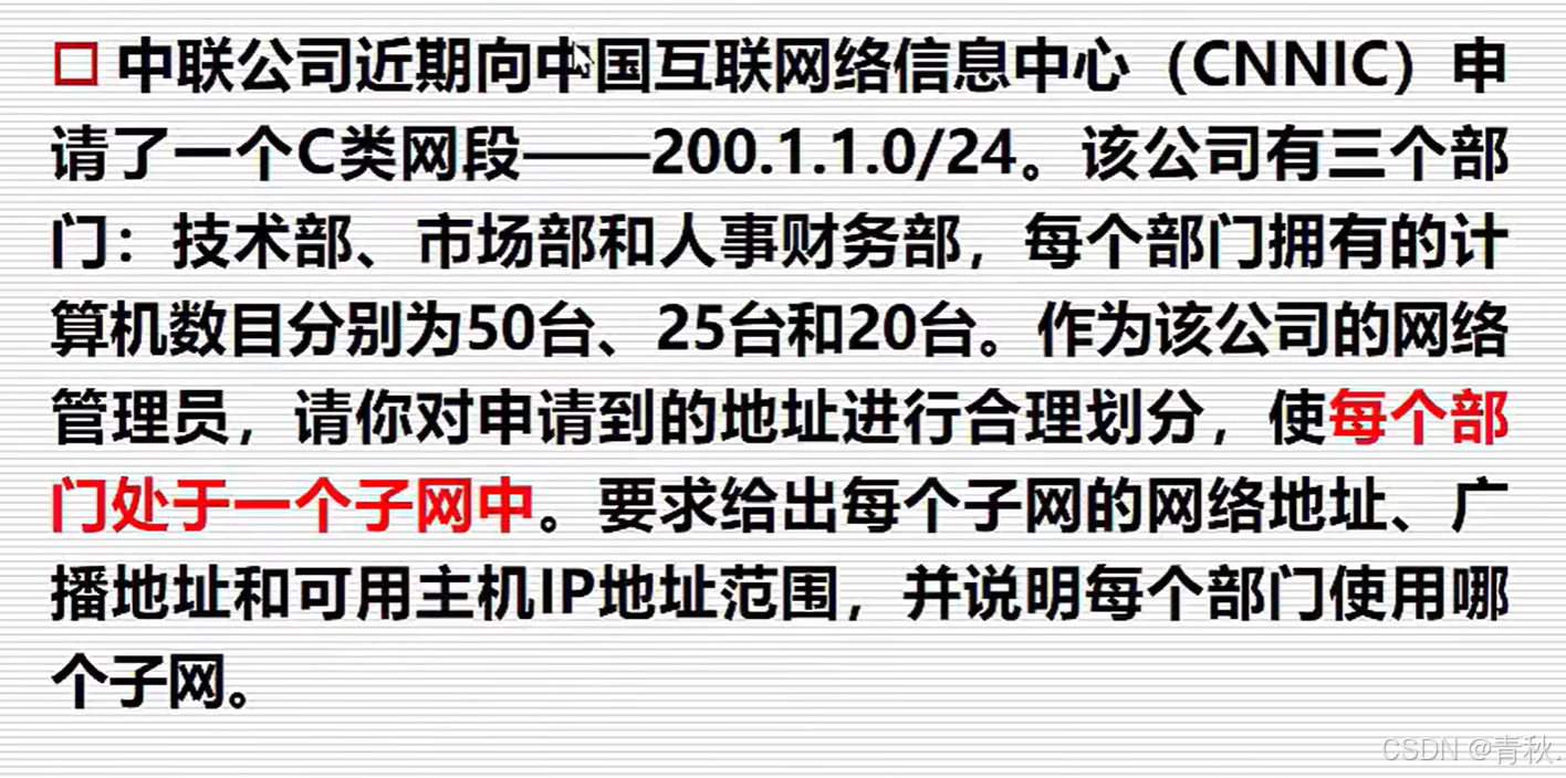 因为上述案例中有三个部门,所以子网数=3,那么要借2 位子网号,可以表示 4 个子网(00,01,10,11),每个子网可分配主机数(减掉全 0 和全 1)