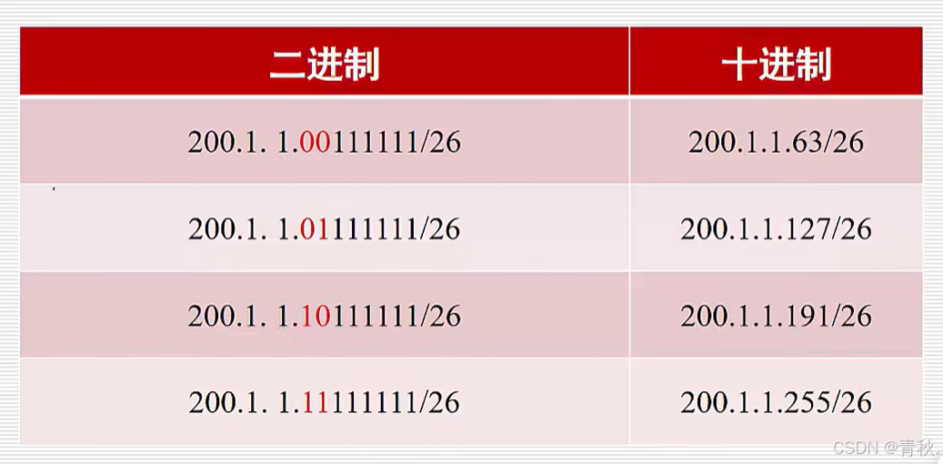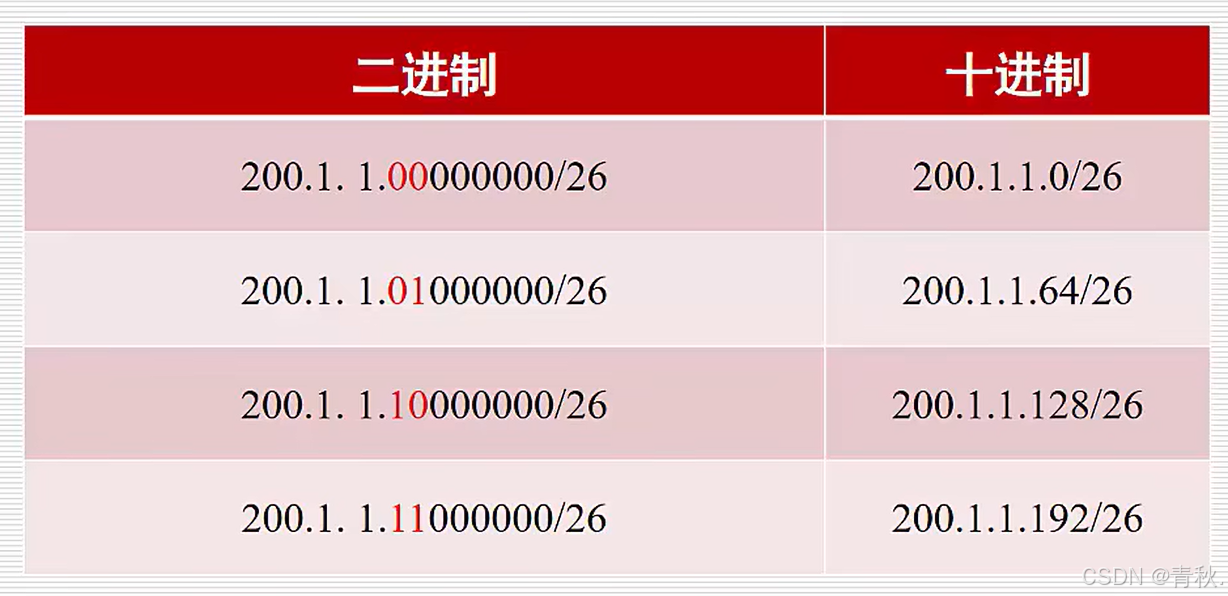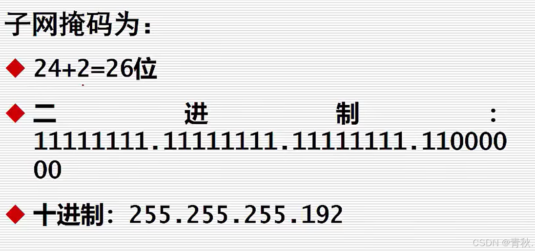 上述 C 类网段掩码是 24,借了 2 位就是 26,(注意!!这里是从主机号那里借了 2 位作为子网号)写成二进制:1111 1111.1111 1111.1111 1111.xx00 0000,再写成十进制即是每个子网的子网掩码,xx 就是 00,11,01,10