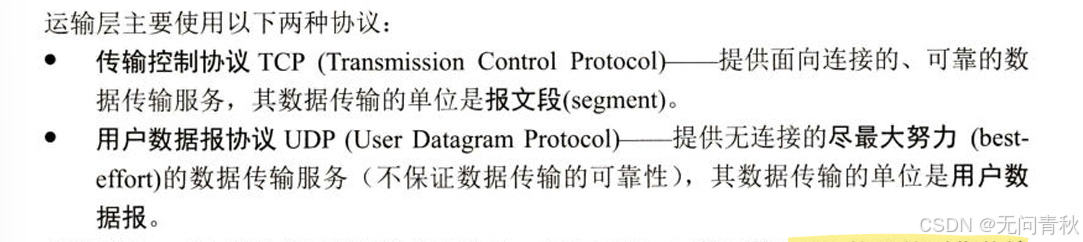 负责向两台主机中进程间提供通用的数据传输服务。运输层有复用和分用功能,复用是多个应用层进程同时使用下面运输层的服务,分用是把收到的信息分别交付给应用层的相应进程。