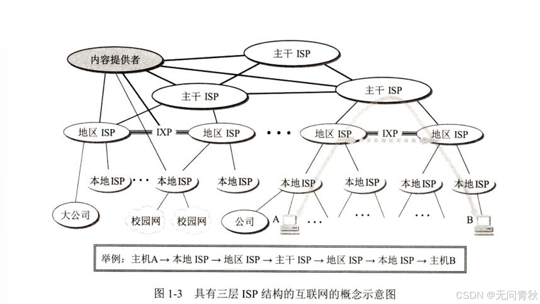 - 第三阶段:逐渐形成了全球范围的多层次 ISP 结构的互联网。所谓 ISP 就是互联网服务提供者,中国移动、电信就是我我国有名的 ISP。ISP 可以从互联网管理结构申请很多 IP 地址(IPV4 地址是有限的)并租给用户使用。为了应对互联网数据流量急剧增长,互联网交换点 IXP 诞生,其作用就是允许两个同级的 ISP 直接相连交换分组,不需要借助父级 ISP,这样就提升了数据转发速率。