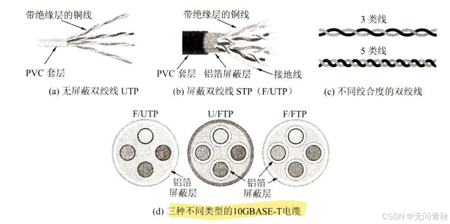 双绞线:两个相互绝缘的铜导线绞合在一起,绞合可以减少一定的电磁干扰。