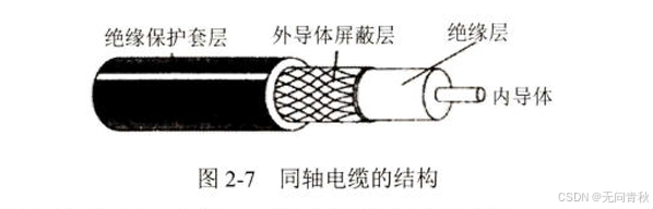 同轴电缆:由内导体铜质芯线、绝缘层、网状编制的外导体屏蔽层、绝缘保护套组成。