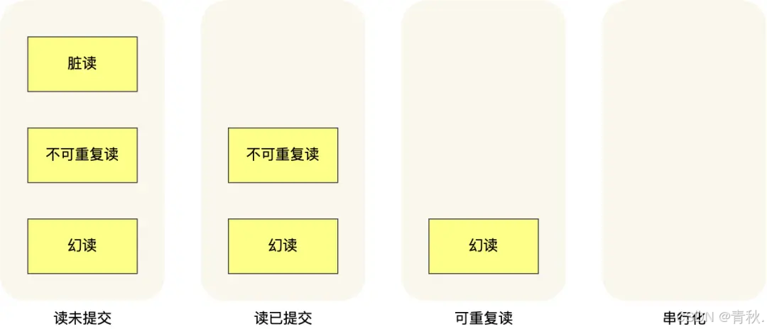 - 读已提交和 可重复读 隔离级别是基于 MVCC 实现的,可串行化 隔离级别是通过锁来实现的。