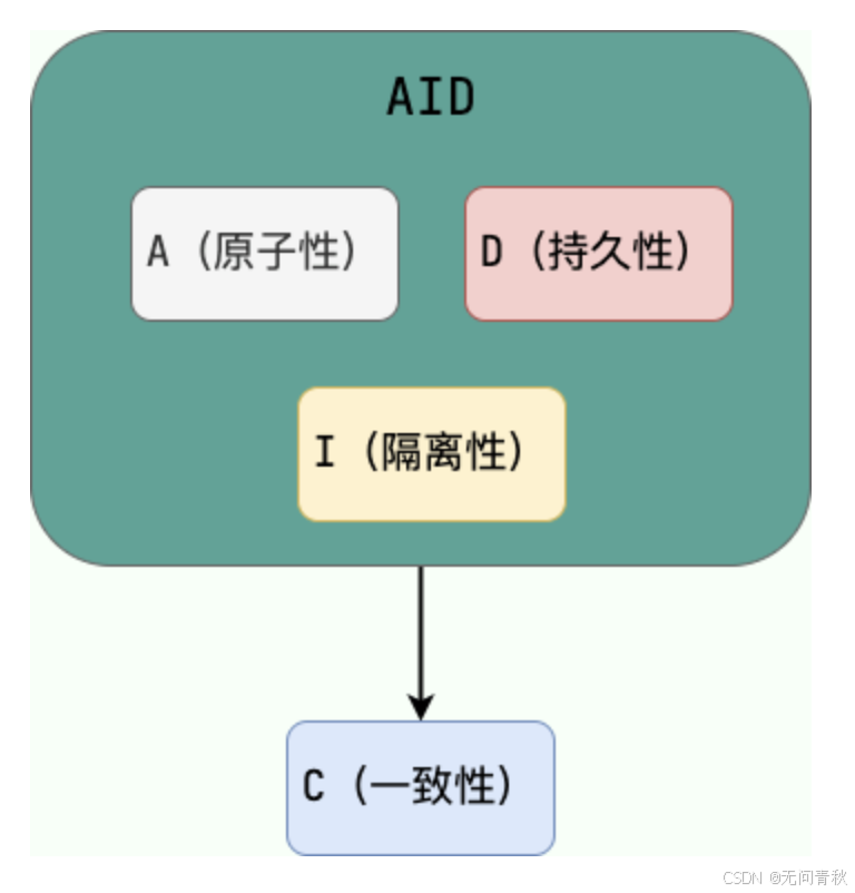 Durability):一个事务被提交之后。它对数据库中数据的改变是持久的,即使数据库发生故障也不应该对其有任何影响。只有保证了事务的持久性、原子性、隔离性之后,一致性才能得到保障。也就是说 A、I、D 是手段,C 是目的!