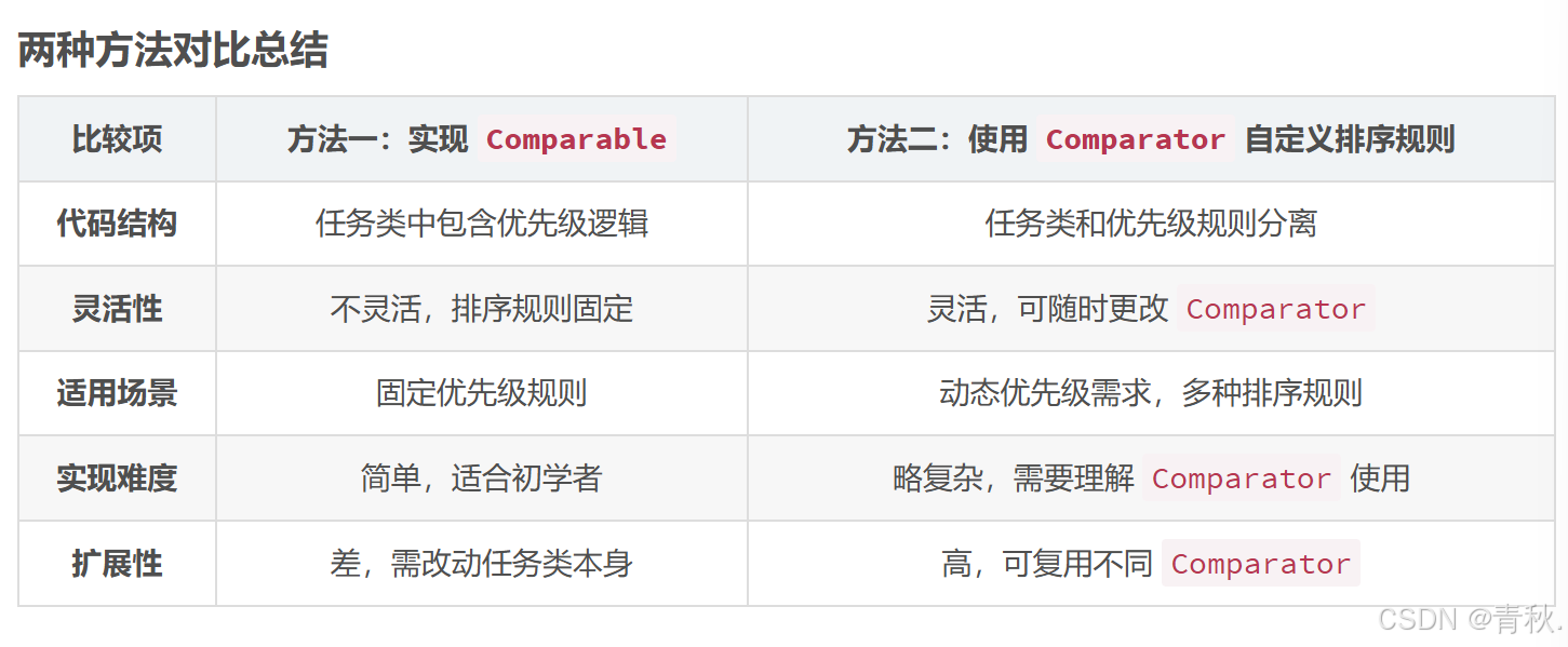 return Integer.compare(this.priority, other.priority); // 优先级值越小,优先级越高