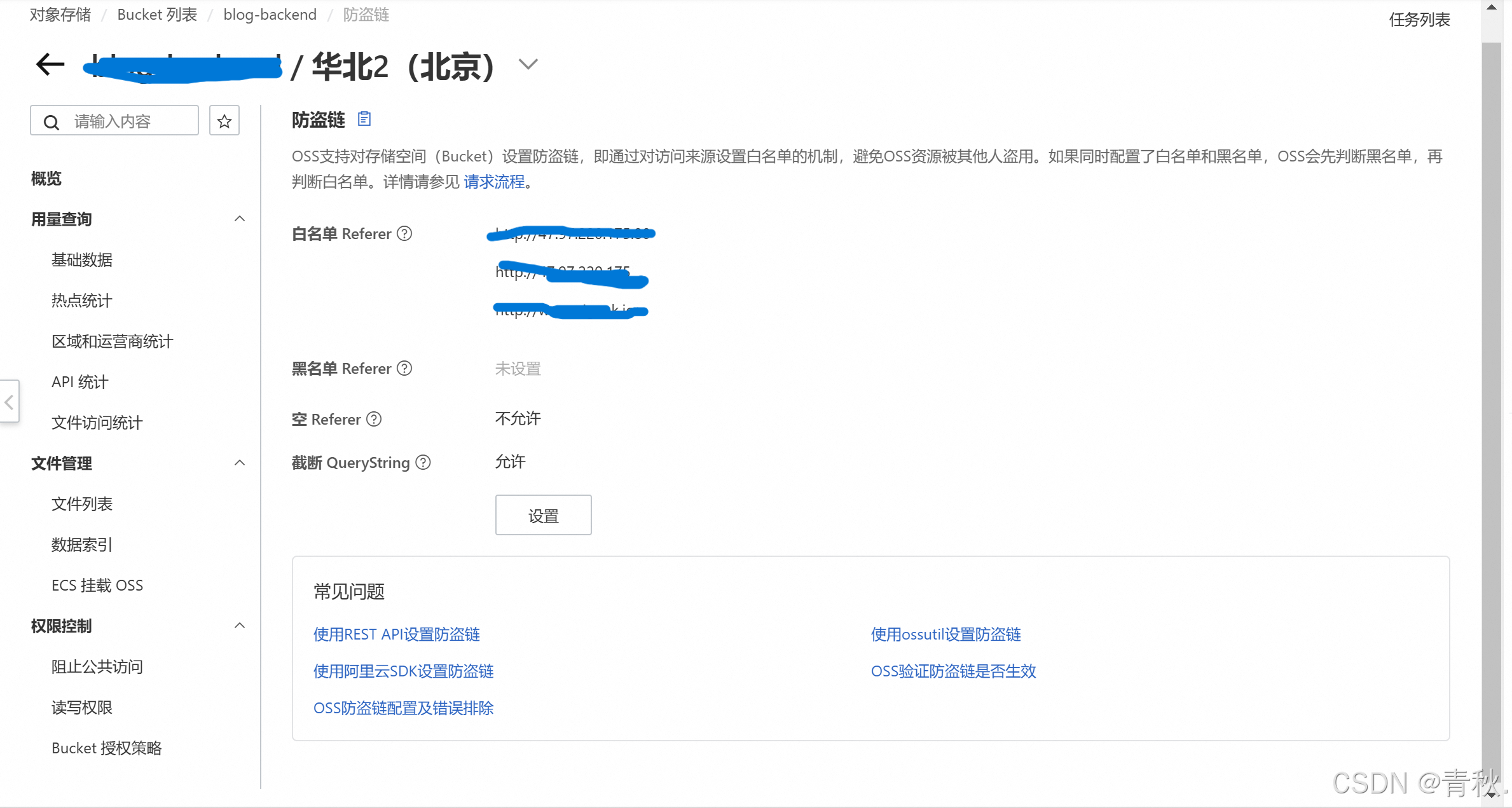 我们存储在 oss 的图片通过图片 url 来访问,如果有其他用户拿到了我们的图片 url 进行访问就会刷我们的流量甚至欠费,所以最好设置防盗链,白名单加上前端部署的域名即可
