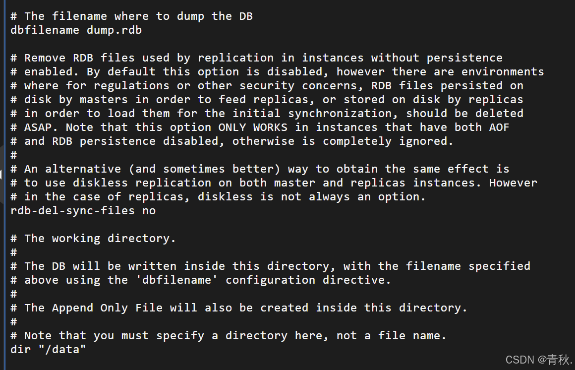 - -v 是挂载目录,简单来说就是把服务器的本机目录文件和容器内的某个目录文件做个映射,我把服务器的/data/blog_redis/data 目录映射到了容器内的/data 目录,这个目录用来存 redis 的数据文件,所以需要改 redis.conf 文件中存放数据的配置,我的数据文件存到了/data 下: