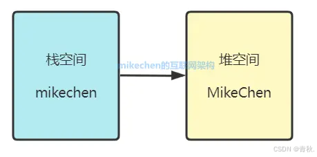 在一个方法的内部有一个强引用,这个引用保存在 Java 栈中,而真正的引用内容(MikeChen)保存在 Java 堆中。
