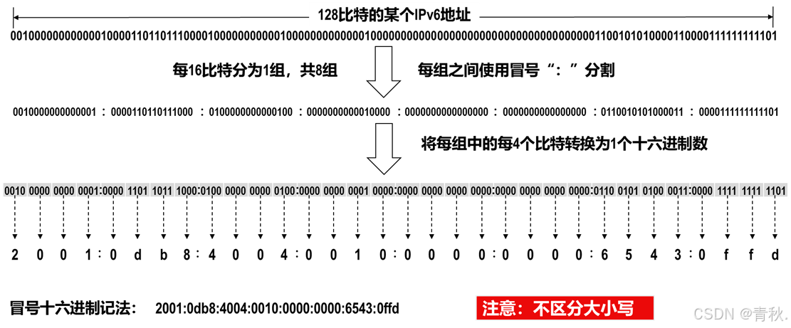 - IPv6 地址表示法,冒分十六进制,x : x : x : x : x : x : x : x