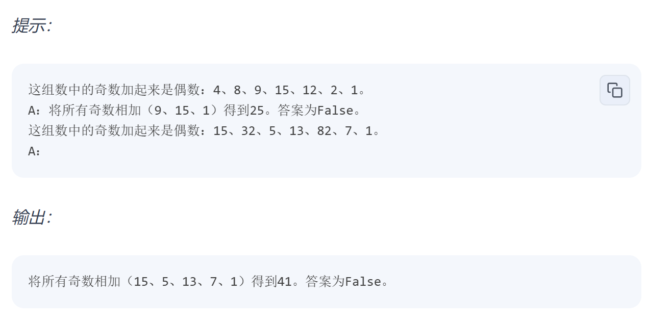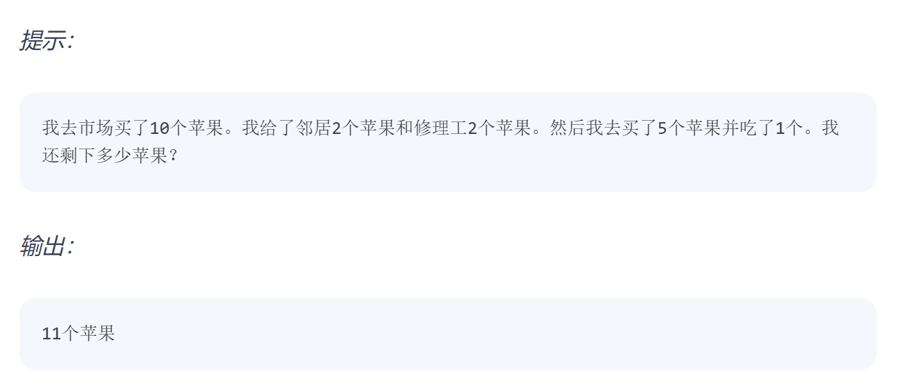 思维链相较于上面的少样本提示,仅添加了推理过程,只需 1 个样本就获得了正确的推理结果。