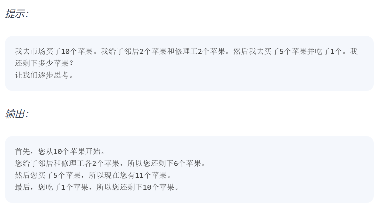 不提供样本,让模型逐步思考,最终得出正确结果:
