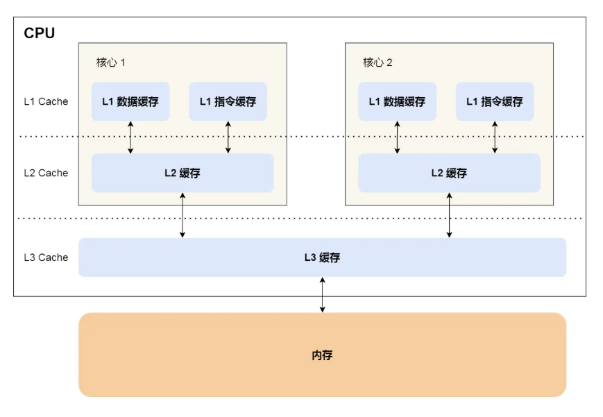 位于 CPU 和和主内存之间的存储单元,在 CPU 内部,有 L1、L2、L3 三级缓存,L1 容量最小,速度最快,通常集成在 CPU 核心内部,L2、L3 次之。