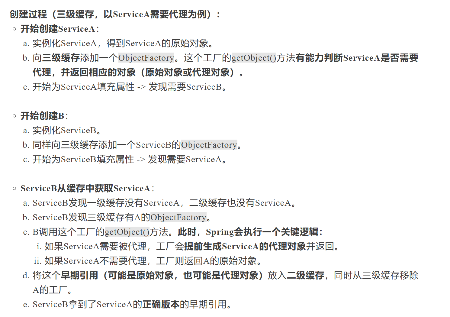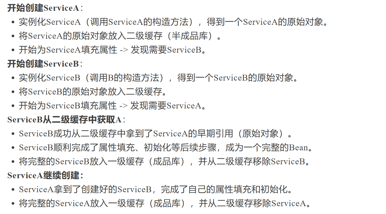 如果 A 类加了@Transactional 等需要创建代理的注解,那么最终需要暴露给其他 Bean 的应该是 ServiceA 的代理对象,而非 ServiceA 的原始对象!,在上述二级缓存方案中,B 拿到的是 A 的原始对象。但最终 A 完成后,放入一级缓存的是 A 的代理对象。这就导致了:B 持有的是 A 的原始对象。而其他没有和产生 A 依赖循环的地方注入的是 A 的代理对象。