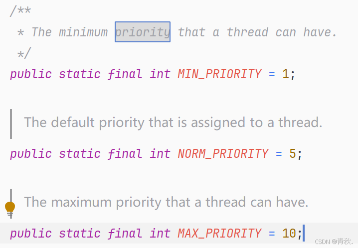在 Thread 类中,最小优先级是 1,最大是 10,默认为 5,优先级越高,该线程抢到 cpu 执行权的机会越大(注意是机会很大,不是 100%)
