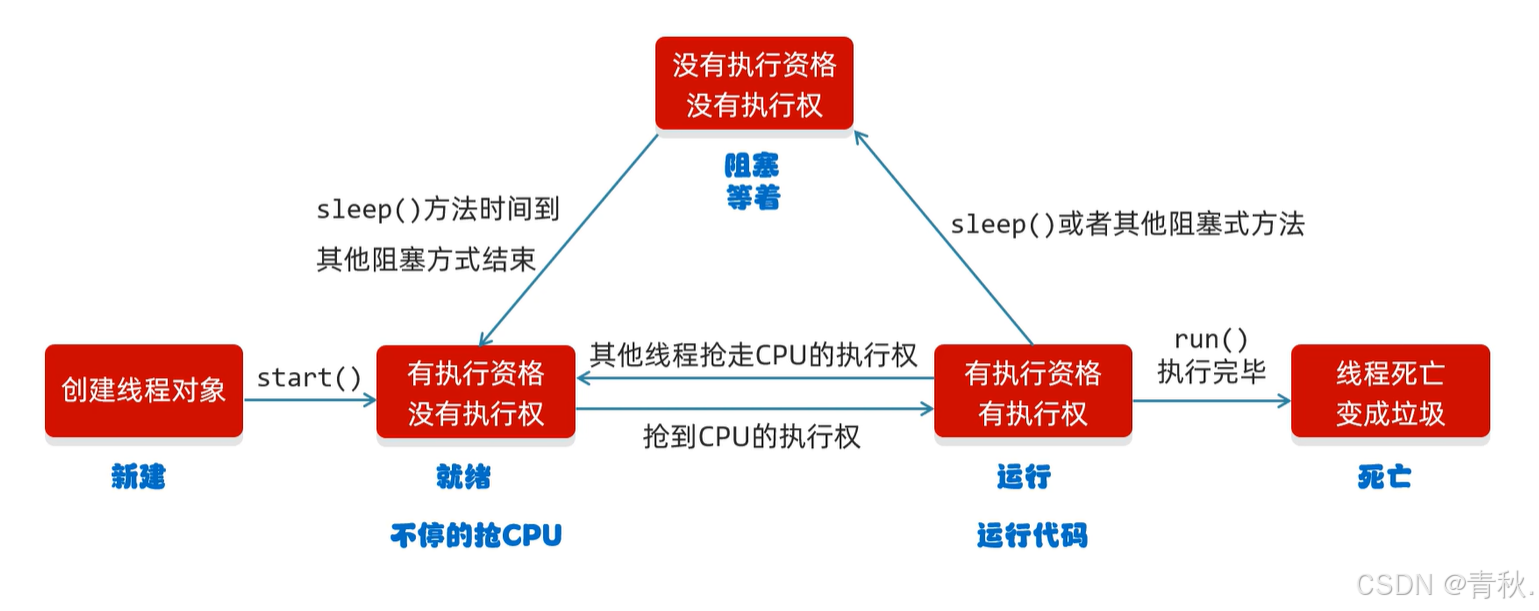 - 抢占式调度:多个线程抢夺 CPU 的执行权,CPU 在什么时候执行哪条线程是不确定的,执行多长时间也是不确定的,所以抢占式调度它体现了一个随机性。