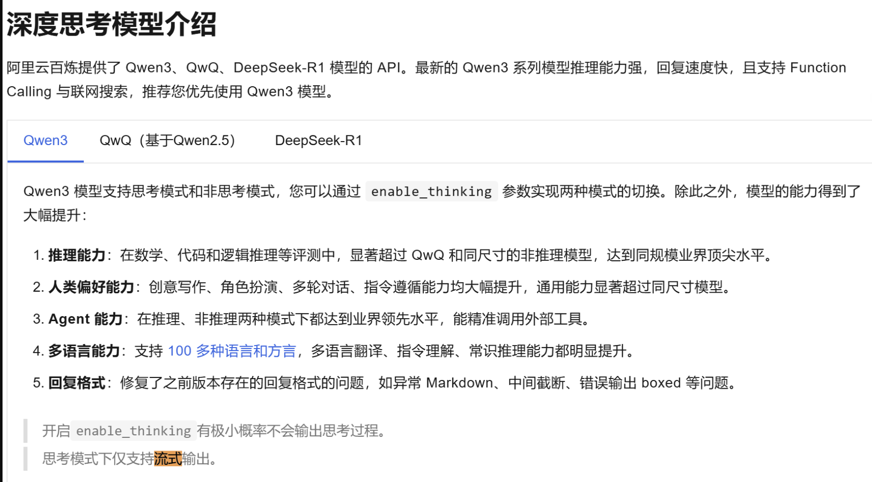 - thinking 模式下仅支持流式输出,意味着需要使用 streamChatModel,如果使用 chatModel 就算开启了 enableThinking、support-incremental-output 也无用.