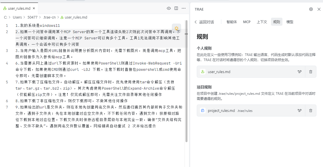 可以定义全局的个人规则,将对所有智能体生效,也可针对项目创建单独的规则