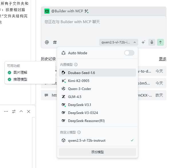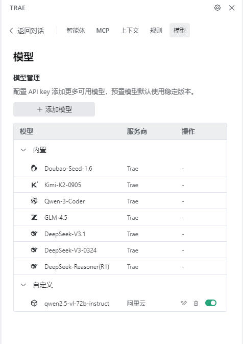 - 非 Auto 模式下,仅能选择一个模型使用,如果选择的模型不支持图片理解,则无法上传图片。如果选择了自定义添加的视觉模型,也不支持上传图片,因为 Trae 不知道你添加的是不是视觉模型(无法上传图片指无法粘贴上去也没有上传按钮)