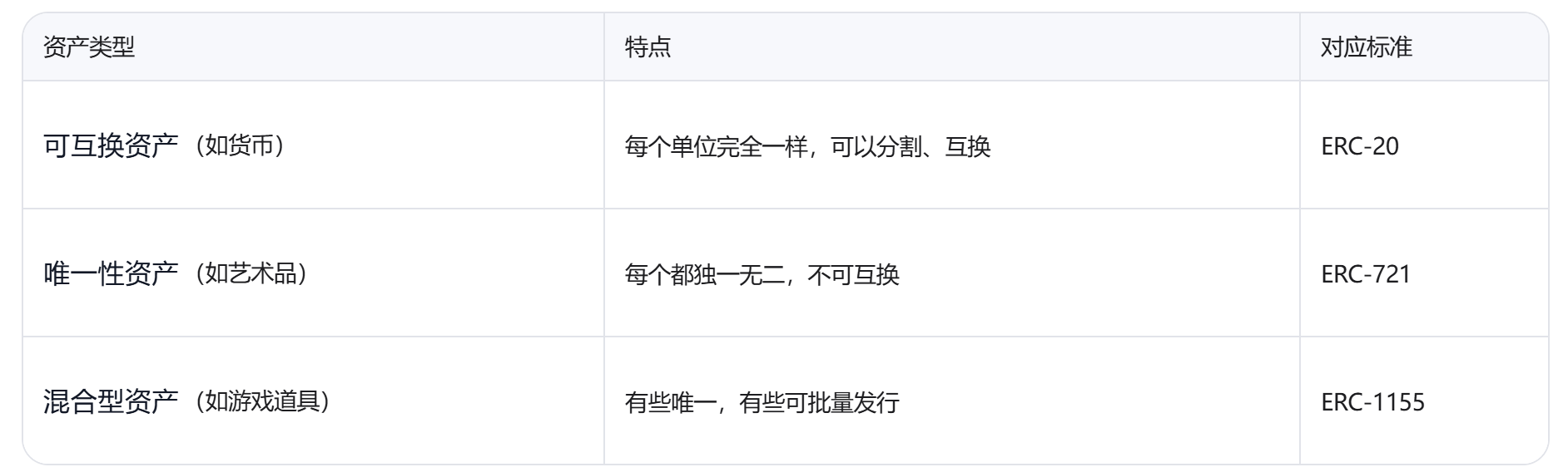 由上可知代币属于数字资产,那么为了满足不同类型数字资产的需求,就有了不同的代币标准(ERC)。