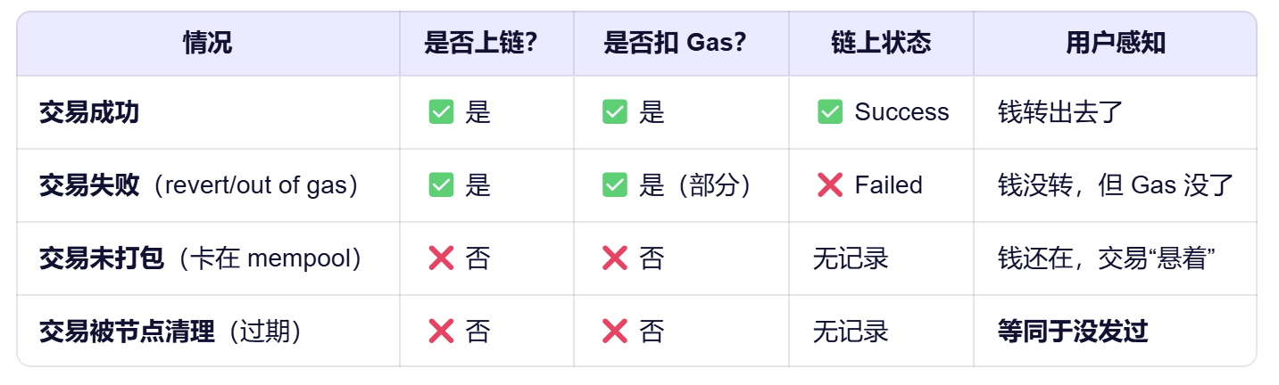 Gas 费也不是可控的,只能控制“愿意支付多少”,但实际费用受网络拥堵影响,存在一定不确定性。如果是交易高峰期,网络拥堵,交易可能因出价太低而长时间不被打包,因为矿工/验证者会优先打包出价更高的交易(给的 Gas 费多)。但没有被打包并不意味着交易失败,而是可能被卡在内存池,直到网络拥堵缓解,你的出价变得相对有竞争力从而被矿工打包,或者发起一笔相同的 nonce 但更高 Gas 费的交易 → 原交易被替换,或者块节点自动清理过期交易(通常 1–7 天后)→ 交易从 mempool 消失,交易撤回(不是失败)