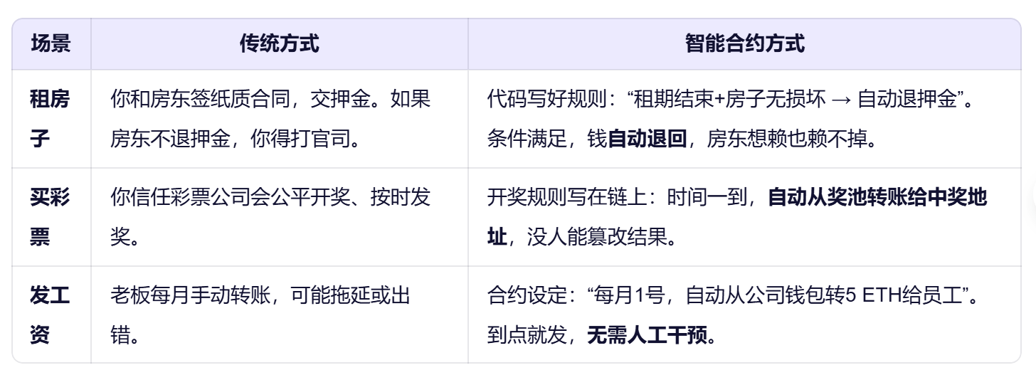 智能合约是约定+执行,靠的是预设的代码规则,而非法律合同,当然也有越来越多国家在承认它,智能合约就像是一个自动售货机:你投币、选商品,机器自动检查钱够不够,如果够,就立刻吐出商品;如果不够,就退钱,全程不需要店员,也不会赖账。