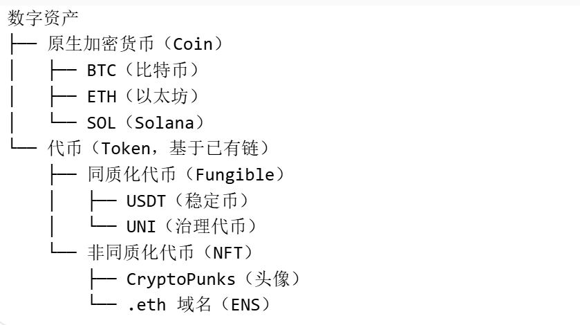 - 加密货币 是区块链的原生资产,类似现实生活的各种货币,用于激励节点、支付交易费用或作为价值载体。