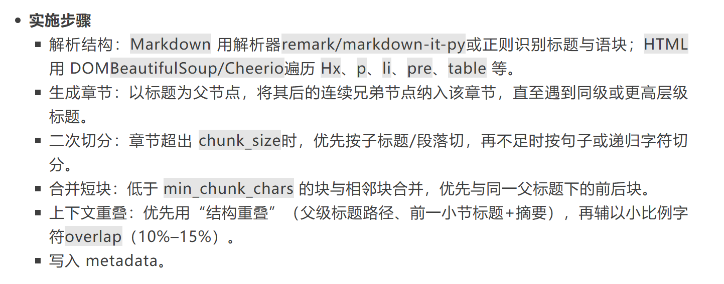和递归字符分块比较像,以标题层级(H1–H6、编号标题)或语义块(段落、列表、表格、代码块)为此类型文档的天然边界,对过长的结构块再做二次细分,对过短的进行相邻合并。