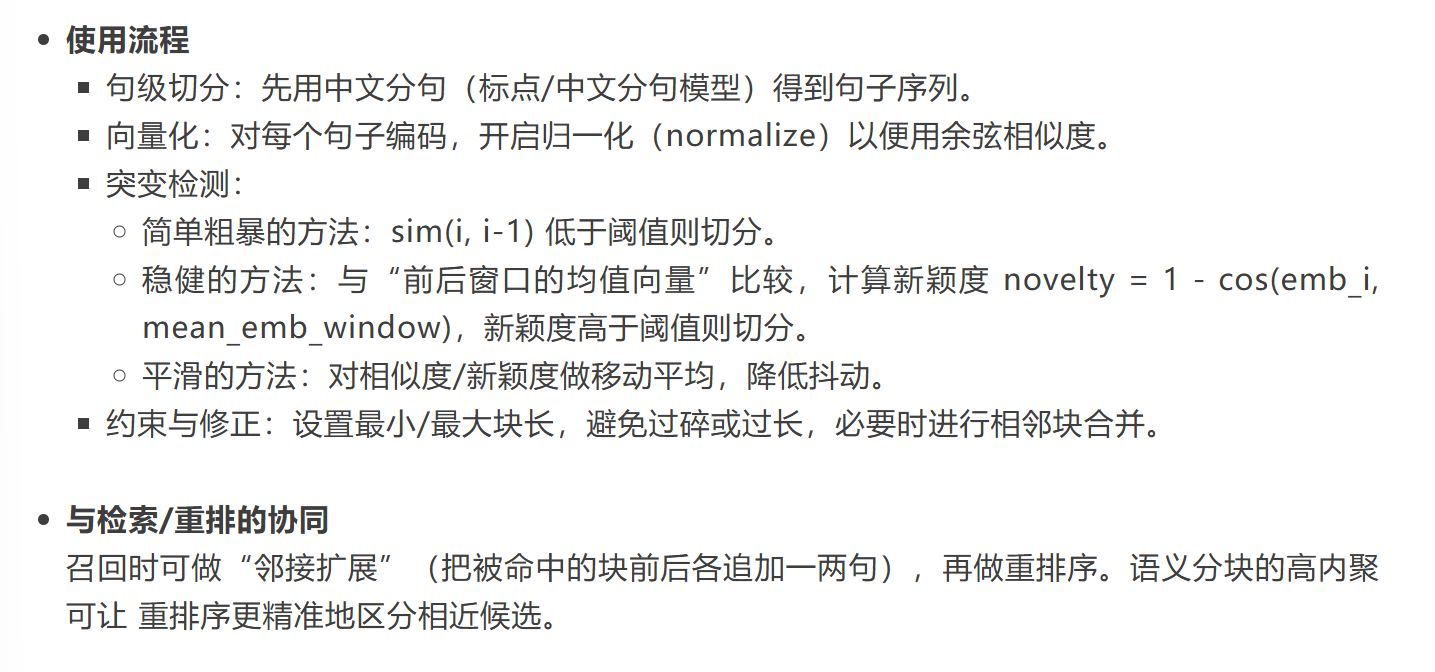 对文本先做句级切分,计算句子或短段的向量表示,当相邻语义的相似度显著下降(发生“语义突变”)时设为切分点。这就有点类似机器学习了,适用于专题化、论证结构明显的文档、白皮书、论文、技术手册、FAQ 聚合页