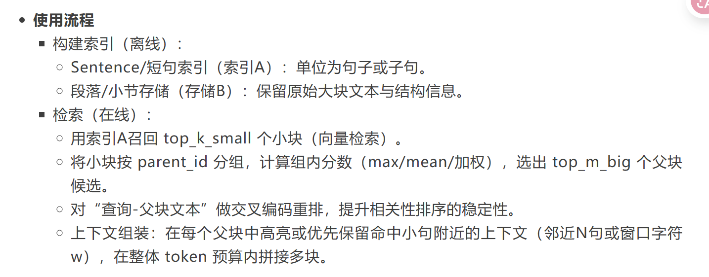 简单来说就是见微知著、以小见大,先用“小粒度块”(如句子/短句)做高精度召回,然后定位到最相关的微片段,然后再将其“所在的大粒度块”(如段落/小节)作为上下文送入 LLM,以兼顾精确性与上下文完整性。