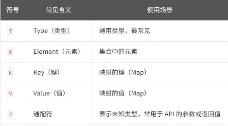 T,E,K,V 是类型参数(Type Parameter),而?是通配符(Wildcard)。他们虽然都用在泛型中,但扮演的角色完全不同。Java 官方并没有强制规定这些字母的含义,只是社区形成了约定俗成的写法。常见规则如下: