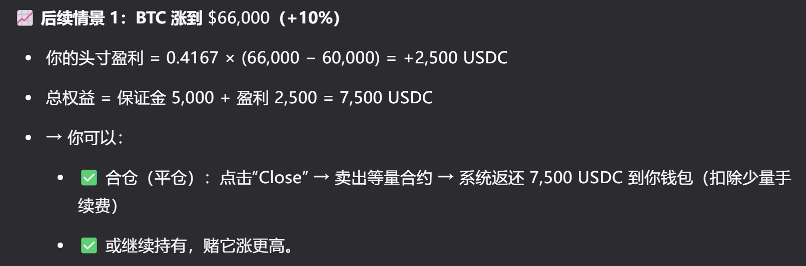 仓位 = 用合约“虚拟持有”的资产头寸,我钱包里有 10,000 USDC,想参与 BTC 价格波动,但不想真的买 BTC(避免托管、转账麻烦),于是选择通过合约进行虚拟持有,具体看下面两个例子。