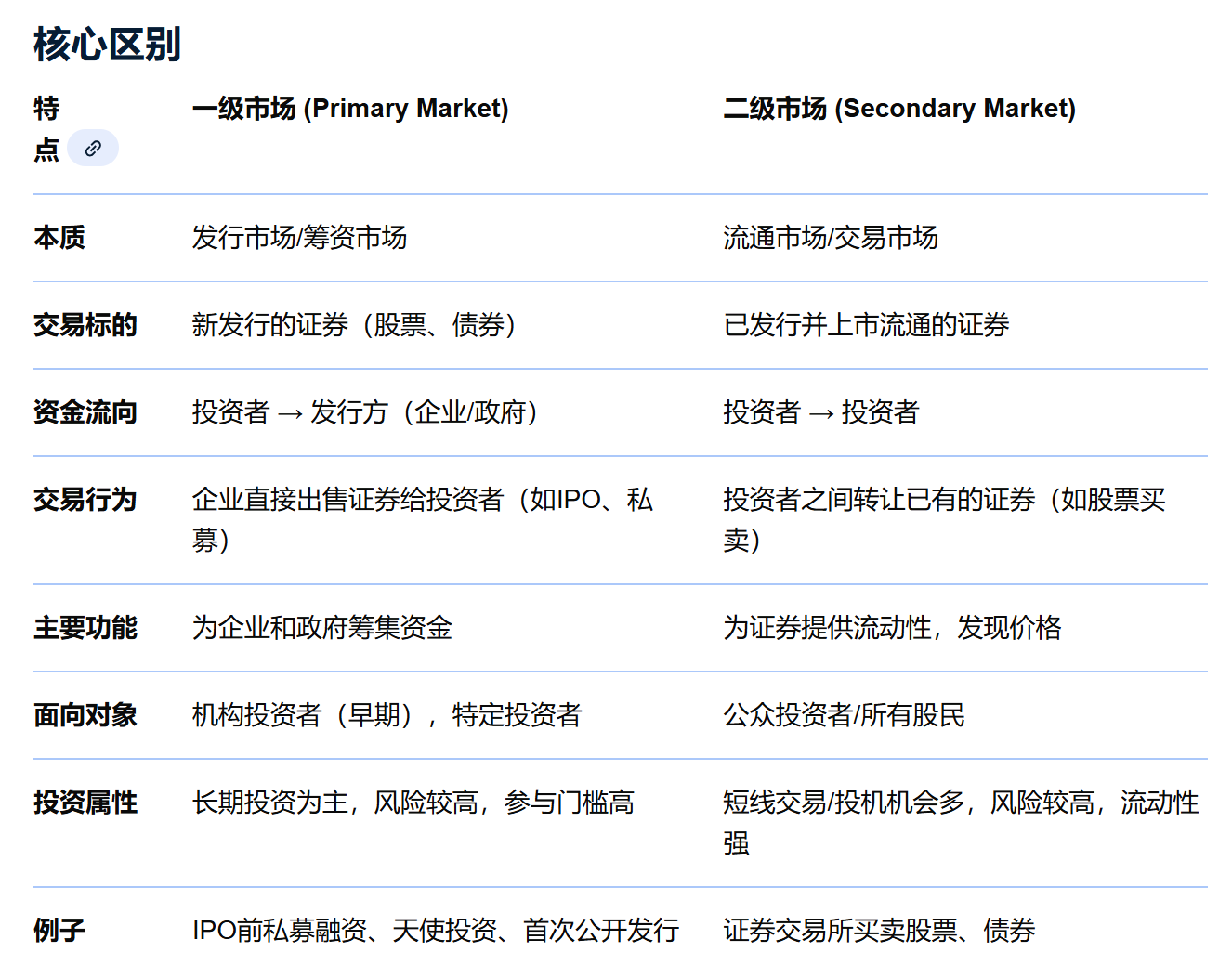 一级市场和二级市场 一级市场是新证券发行、筹集资金的市场(如 IPO),资金流向发行方(企业/政府); 二级市场是已发行证券的流通和交易市场(如交易所买卖股票),资金在投资者之间流动。 核心区别在于交易对象是首次发行(一级)还是已发行(二级),一级市场帮助公司融资,提供长期投资机会,二级市场则提供流动性,以短线交易为主,主要面向大众投资者