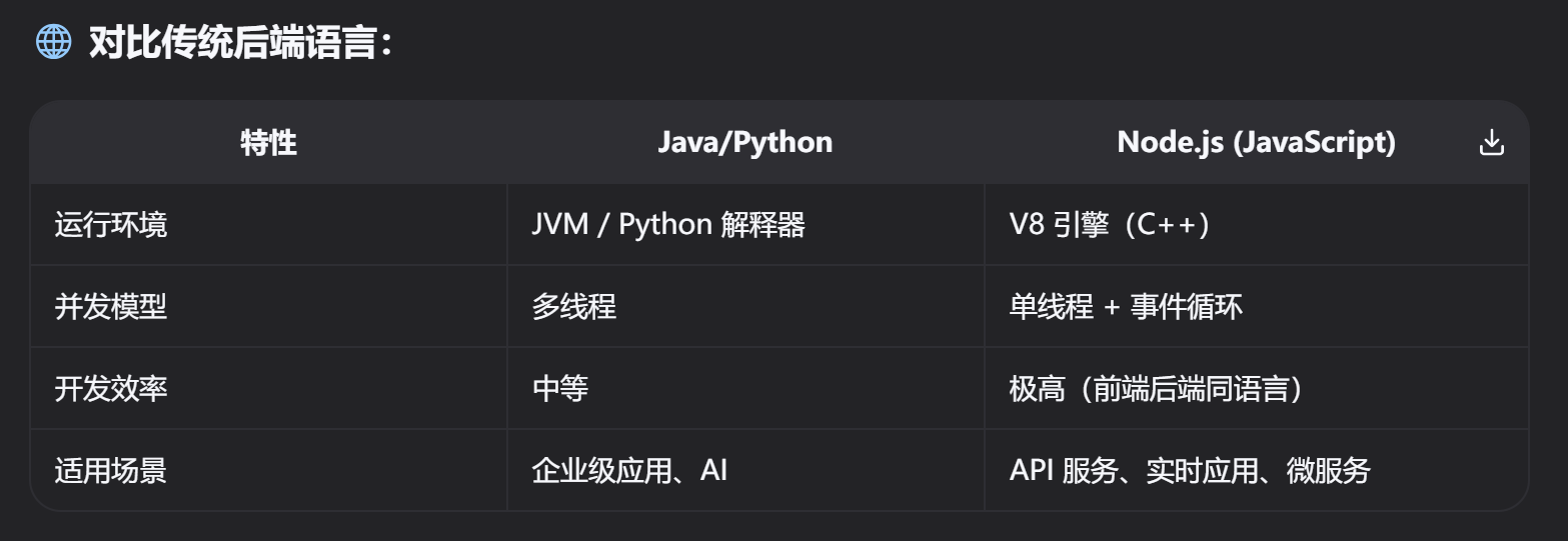 - 事件循环(Event Loop):非阻塞 I/O 模型,适合高并发场景(如 Web API、实时聊天)