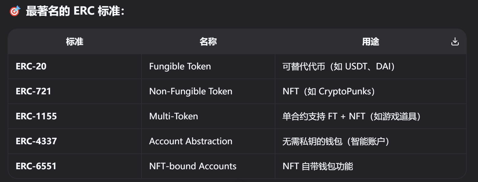 以太坊的EIP和ERC是什么 https://eips.ethereum.org EIP Ethereum Improvement Proposal(以太坊改进提案),EIP 是向以太坊社区提出新功能、流程或标准的正式文档。任何重大变更(如协议升级、新操作码、费用机制)都必须先提交 EIP。 ERC Ethereum Request for Comments(以太坊征求意见稿),ERC 是针对智能合约和 DApp 开发者制定的应用层标准,确保不同项目之间的互操作性。