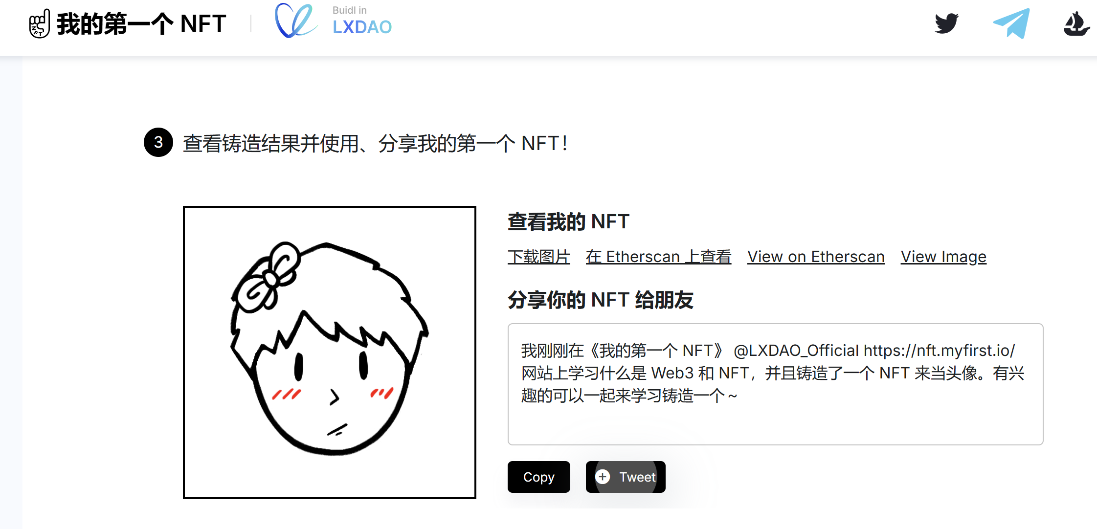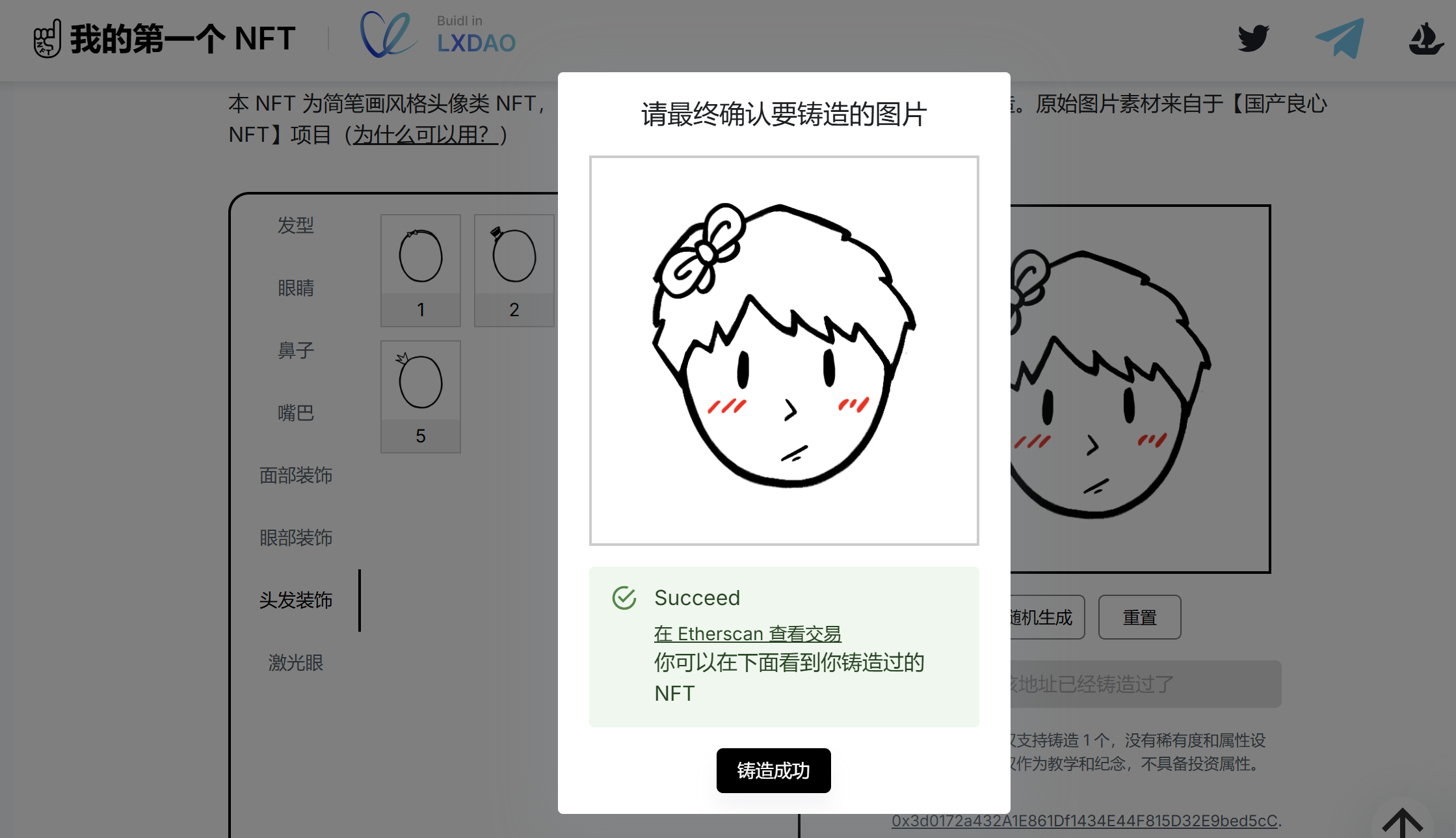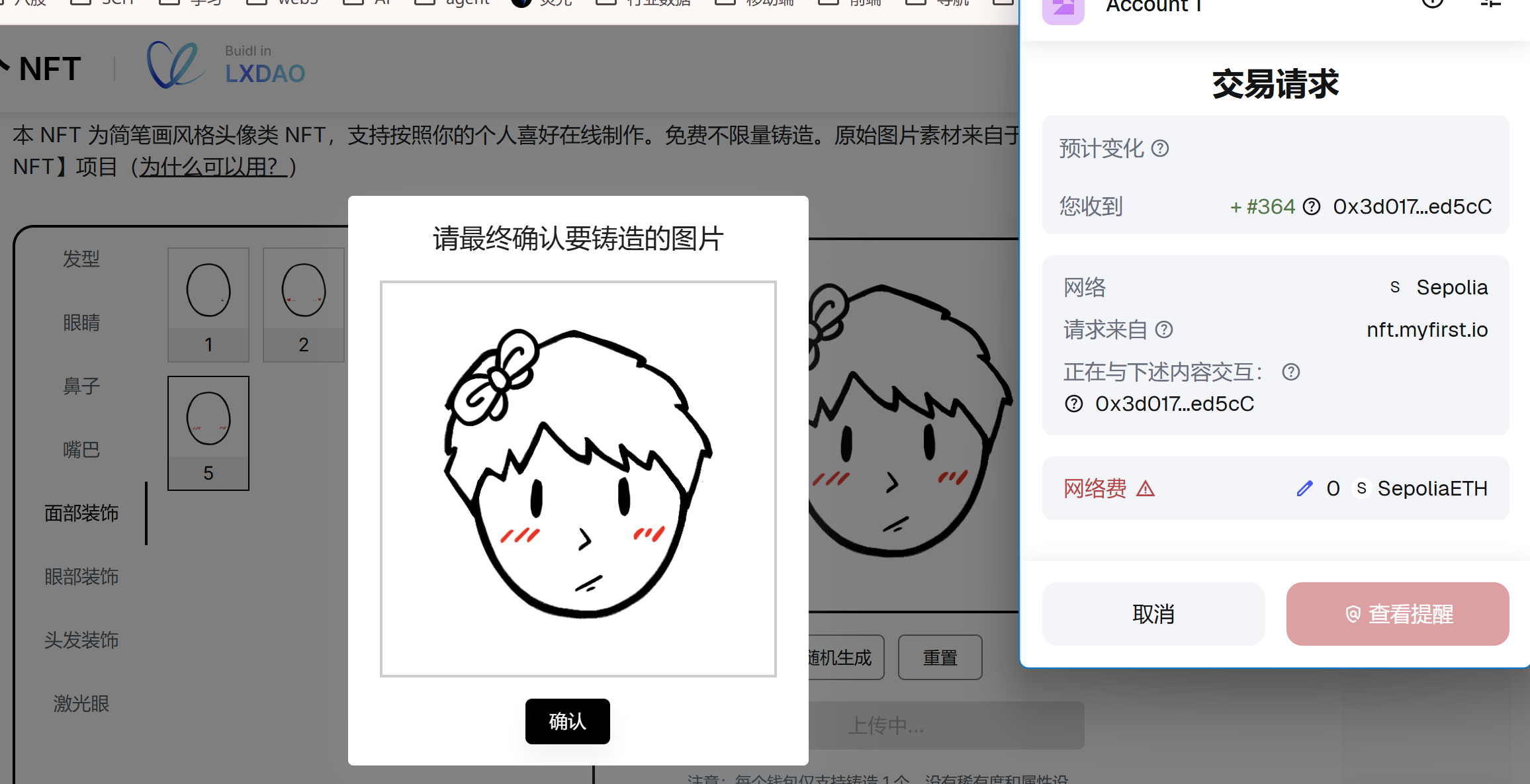 在铸造网站搭配好自己的 NFT 头像后链接 metaMask 钱包,选择 Sepolia 测试网络并确认交易,交易需要支付 gas 费,也就是要消耗上一步领取的测试币,如果没有测试币将无法铸造 NFT。