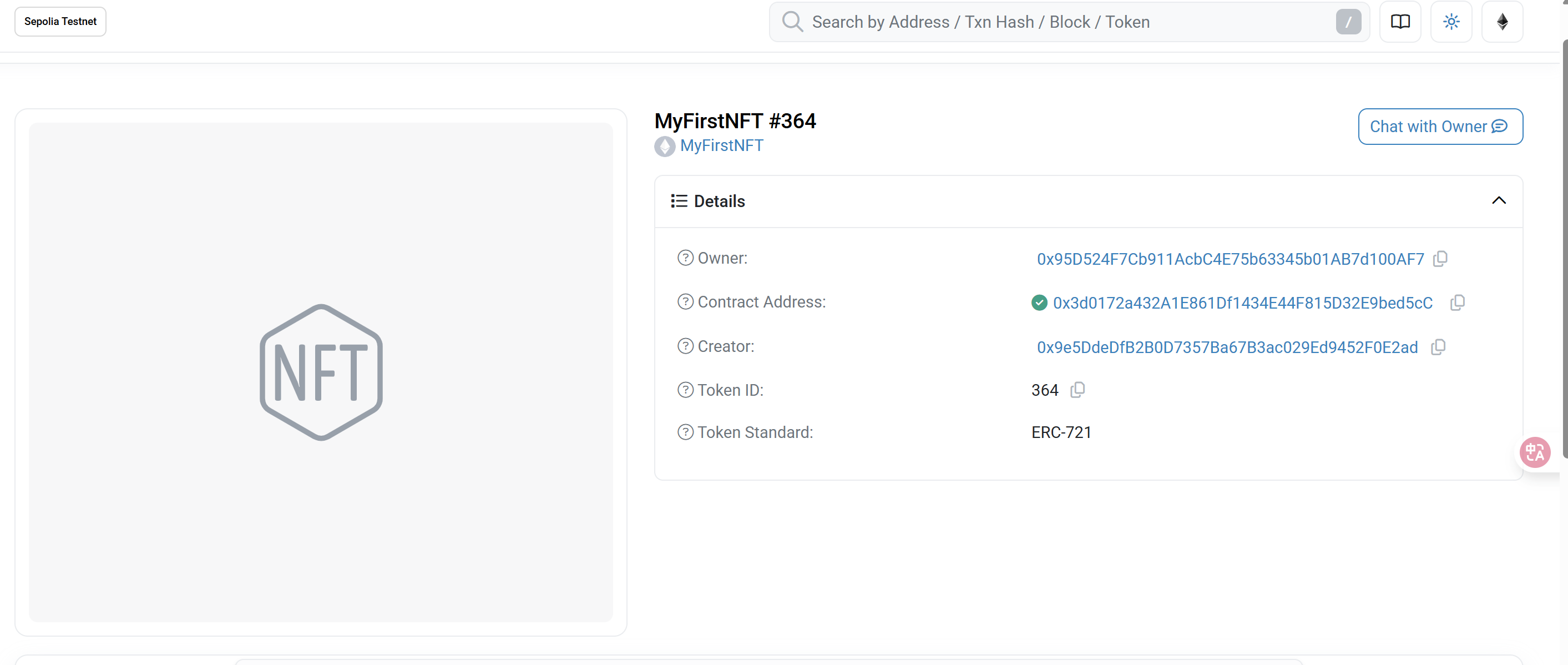 下图可以看到 Token ID、合约地址、该 NFT 所属地址也就是我的钱包地址