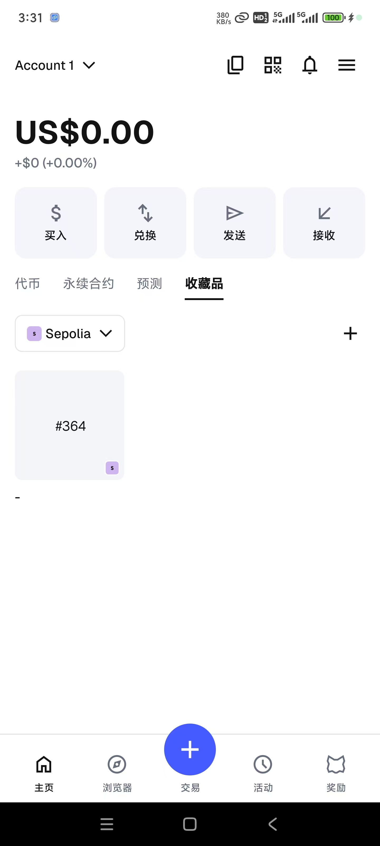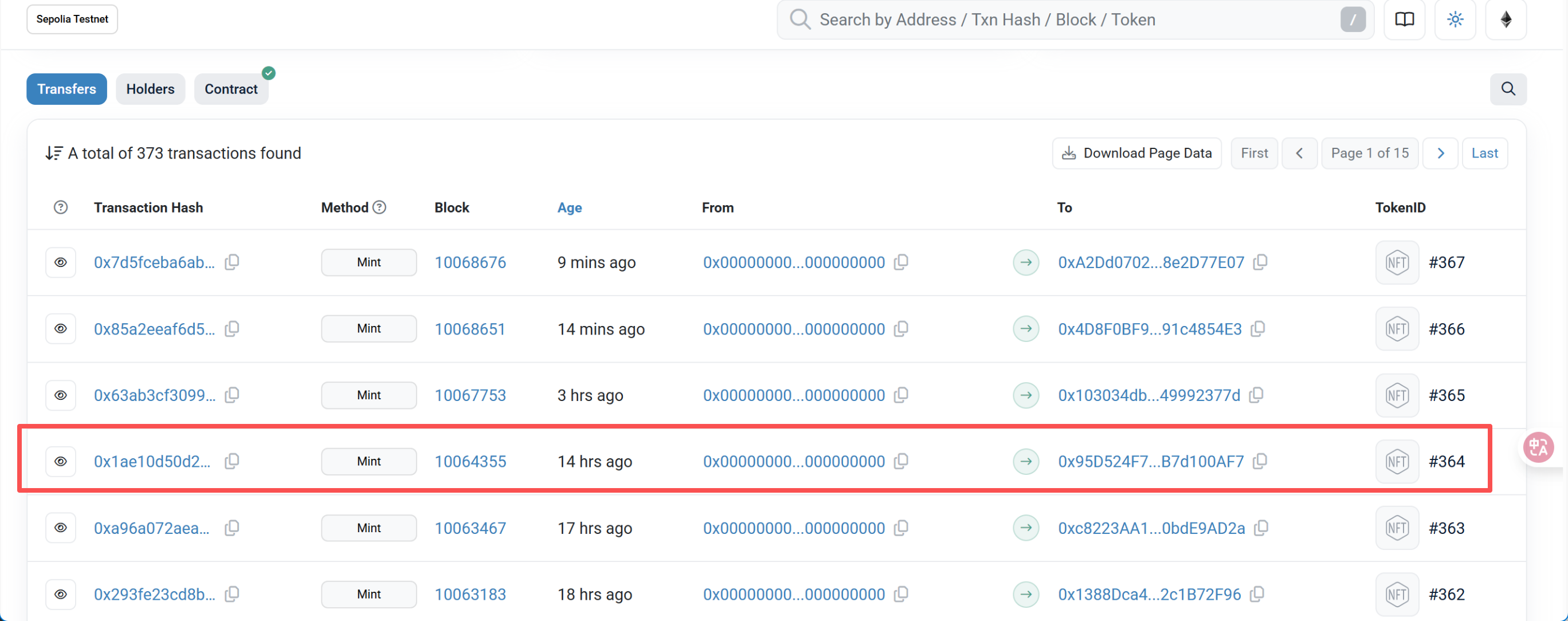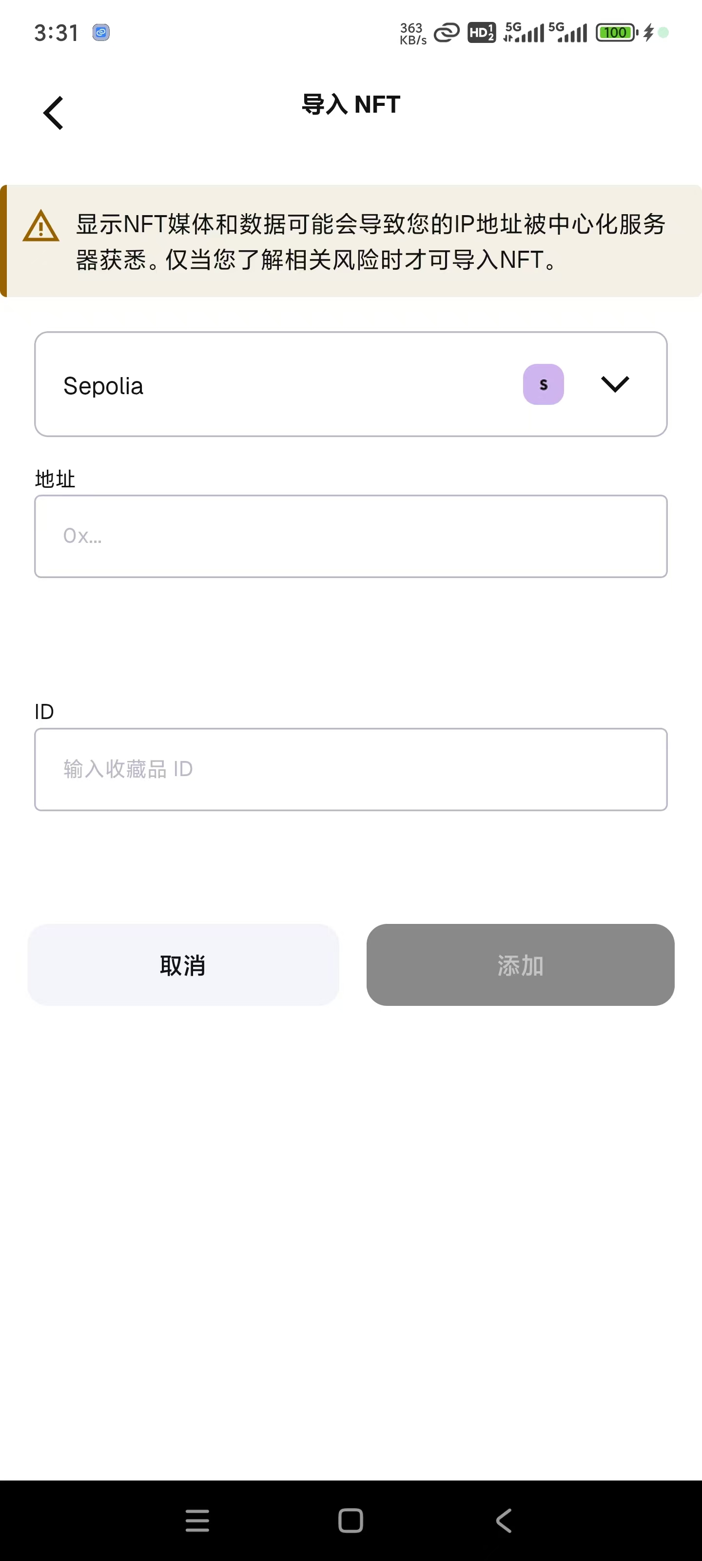 打开 metaMask 钱包,选择 Sepolia 网络,输入铸造 NFT 合约地址,注意不是自己的钱包地址!是 NFT 合约地址!收藏品 ID 是 Token ID,即 364